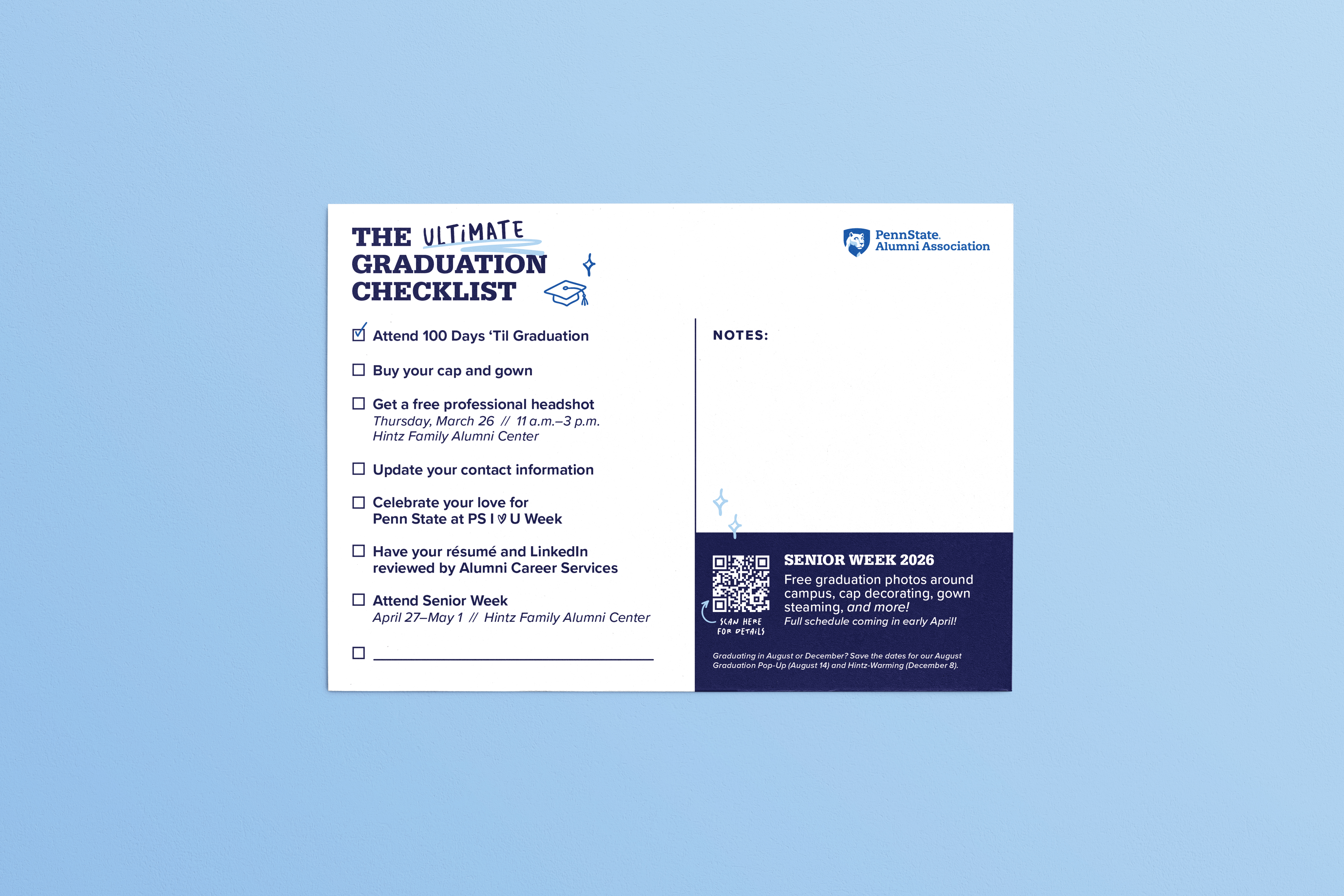 Beyond concept and layout design, I worked with my Creative Director to manage the full production process—ensuring brand compliance, preparing print-ready files, coordinating specifications, and overseeing delivery to guarantee accuracy and on-time distribution. The front of the postcard was printed on full-color coated stock to create a high-quality, polished feel, while the back uses uncoated stock to allow students to easily write and personalize their checklist as they approach graduation.