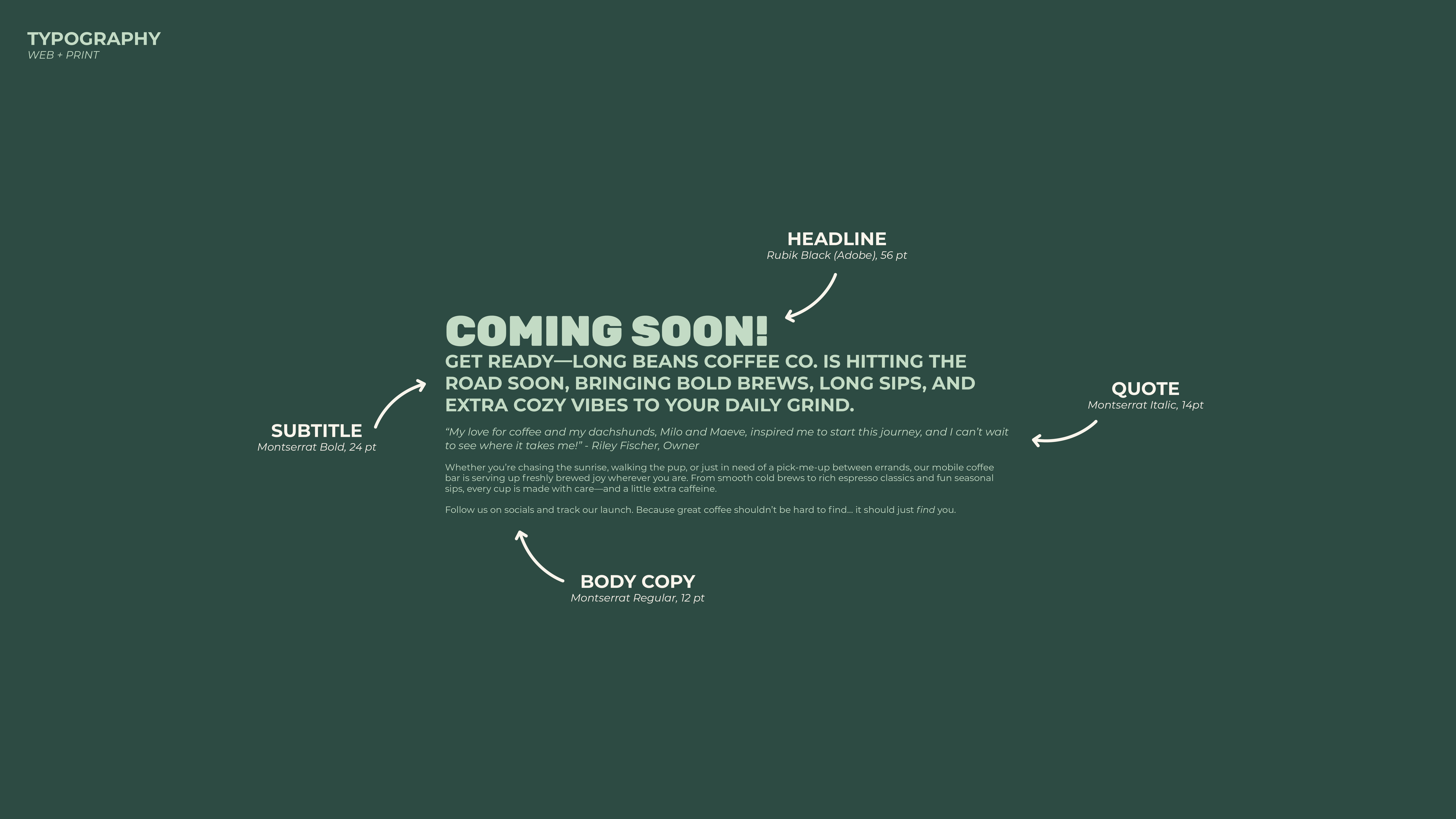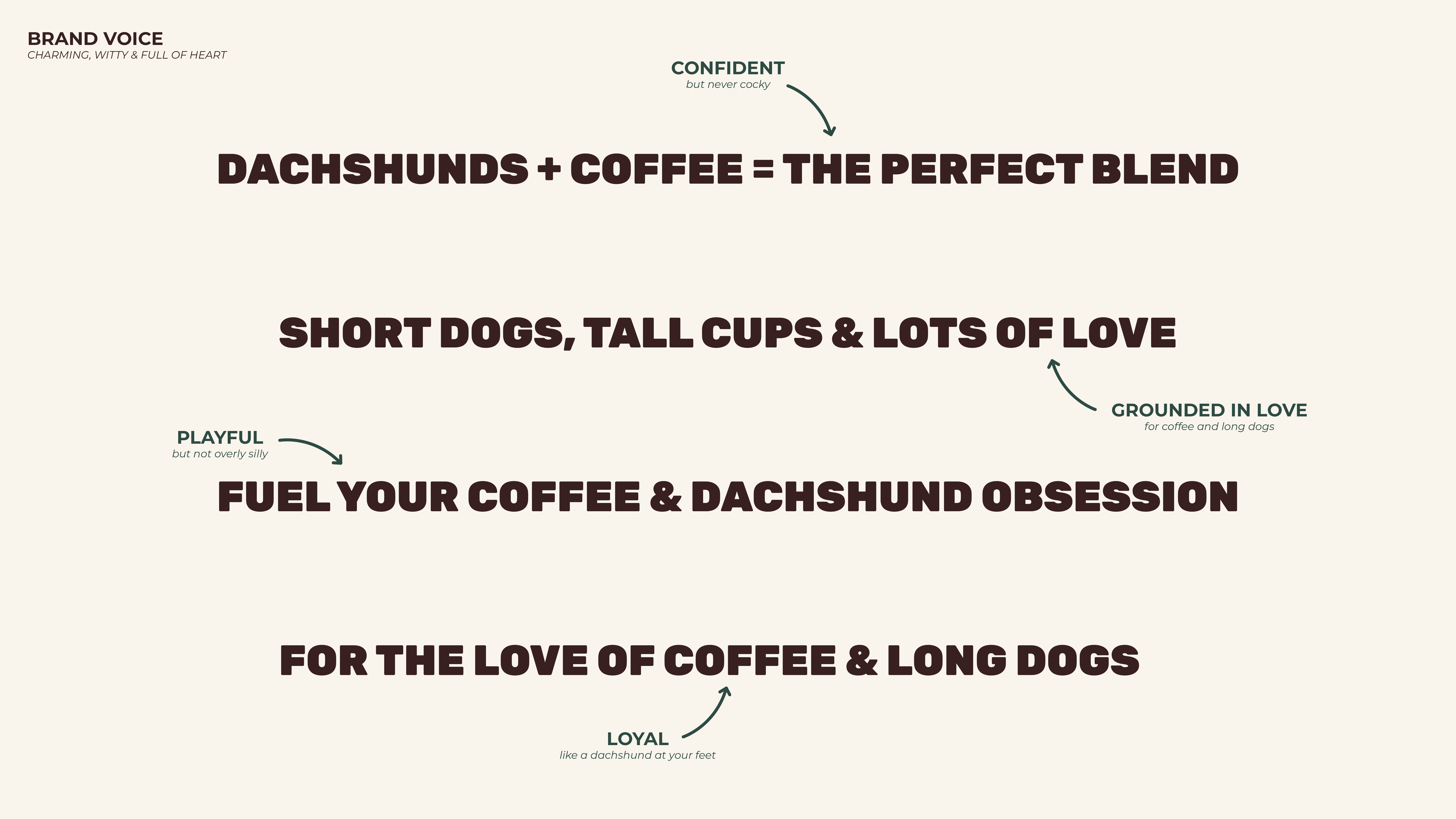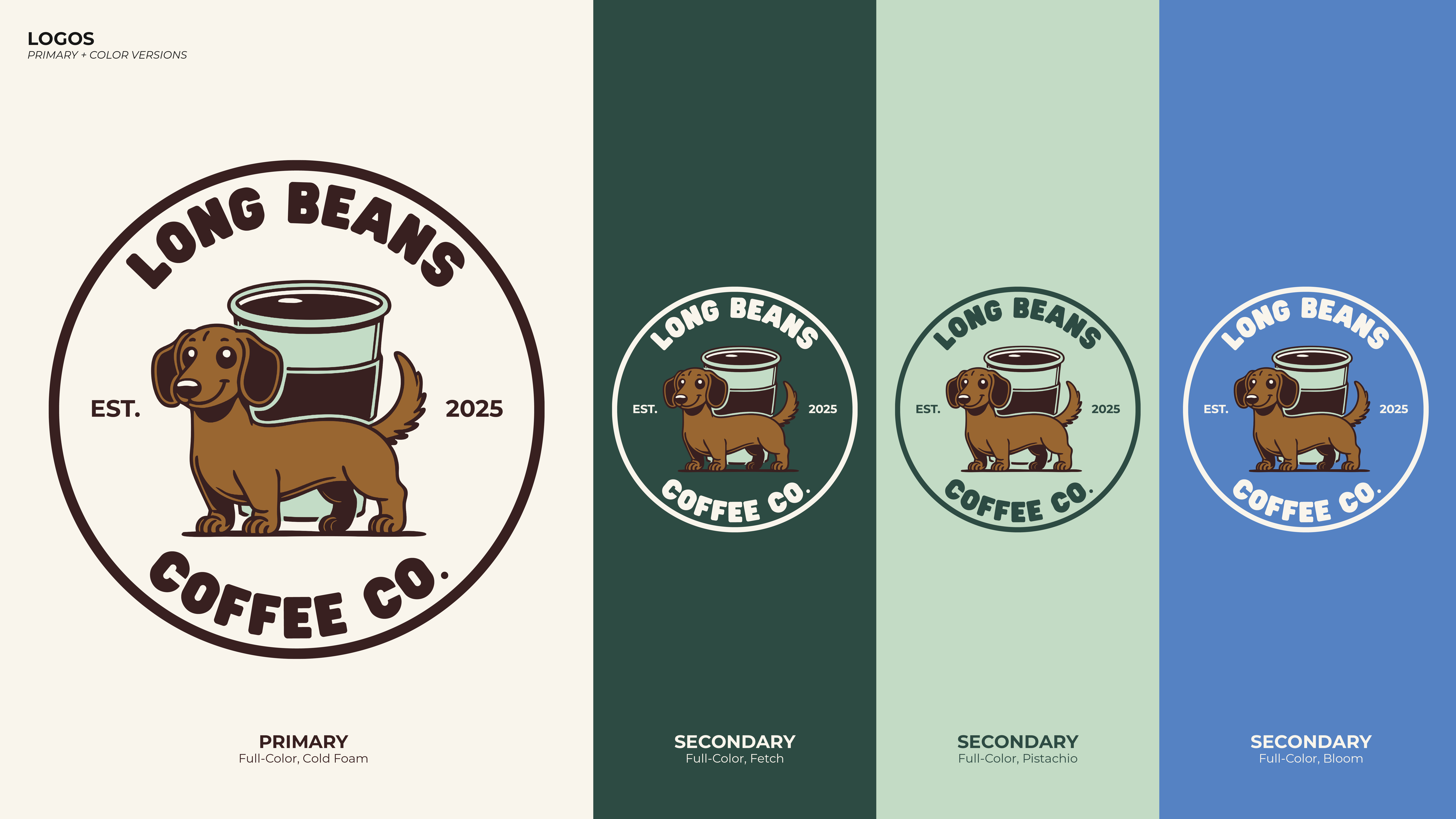 We worked together to make sure that the heart of the brand reflected and celebrated the friendly neighborhood feel, Riley’s love for her daschunds, Milo and Maeve, and the offerings of the brand. This foundation directly shaped the visual identity of Long Beans Coffee Co.—playful, confident, loyal, and grounded in love.